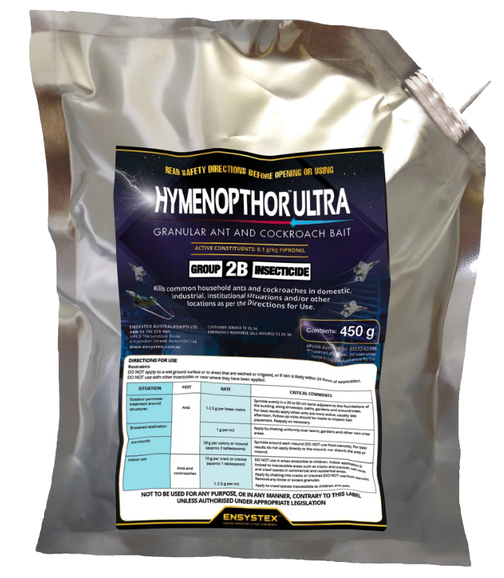 Opens up new opportunities for professional pest managers when dealing with cockroaches. The only granular bait on the market registered for German cockroaches and Periplaneta spp cockroaches. HYMENOPTHOR ULTRA provides exceptional levels of control since it meets the cockroaches’ preference for a solid cereal based diet, which means they eat more of the granular bait. It is especially useful for the control of Periplaneta spp around areas such as grease traps, sewers and manholes. Sprinkling bait granules in these areas is a new management option for fast control.